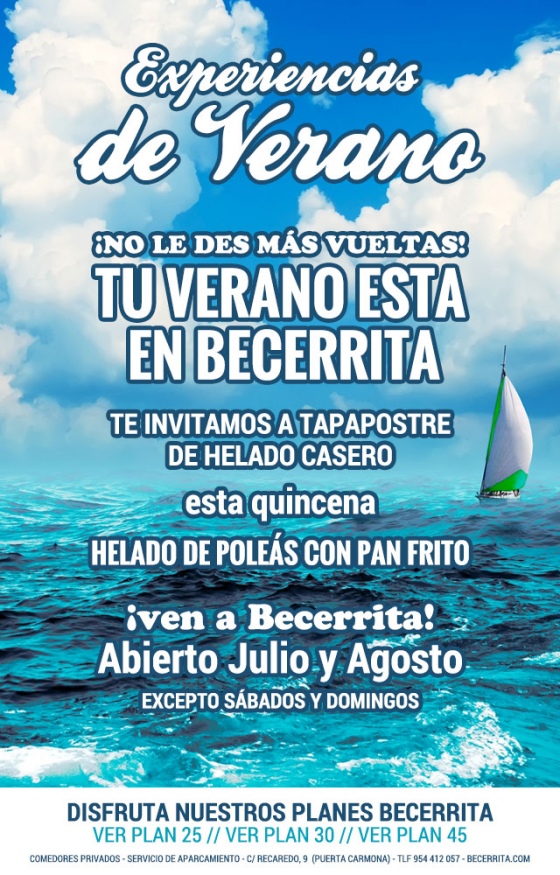¡¡¡NO LE DES MAS VUELTAS!!! TU VERANO ESTÁ EN BECERRITA… – Te invitamos a tapapostre de helado casero. Esta quincena HELADO DE POLEÁS CON PAN FRITO. (Del 15 de Julio al 2 de Agosto de 2015) ¡Ven a Becerrita! – Abierto en Julio y Agosto (excepto sábados y domingos). DISFRUTA NUESTROS PLANES BECERRITA – Ver…
