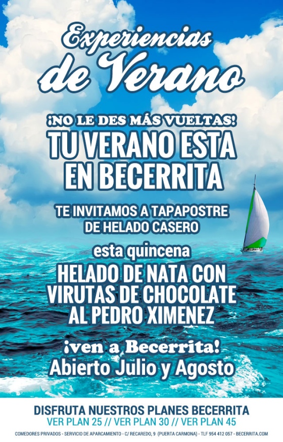 ¡¡¡NO LE DES MAS VUELTAS!!! TU VERANO ESTÁ EN BECERRITA… – Te invitamos a tapapostre de helado casero. Esta quincena HELADO DE NATA CON VIRUTAS DE CHOCOLATE AL PEDRO XIMENEZ. (Del 17 al 31 de Agosto de 2015) ¡Ven a Becerrita! – Abierto en Julio y Agosto (excepto sábados y domingos). DISFRUTA NUESTROS PLANES BECERRITA…