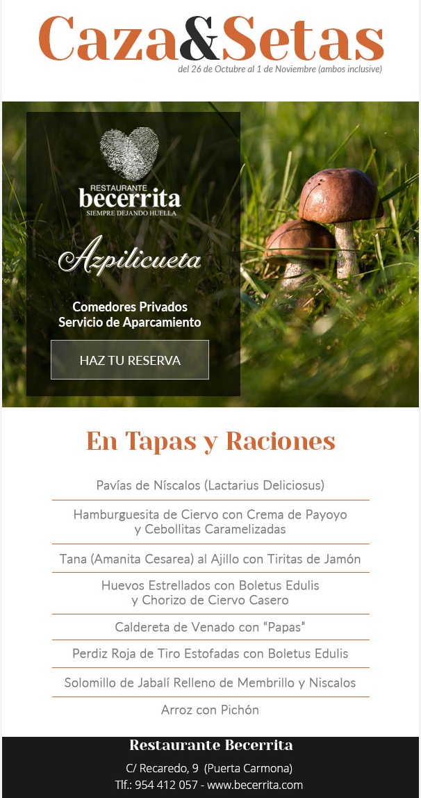 Semana de la Caza y las Setas en Restaurante Becerrita. Del 26 de Octubre al 1 de Noviembre de 2015 en Sevilla (ambos inclusive, almuerzo y cena) Época de caza, recogida de setas, se abre la temporada y el otoño abraza tus emociones. Con nuestras experiencias de otoño, es tiempo de caza y setas en…