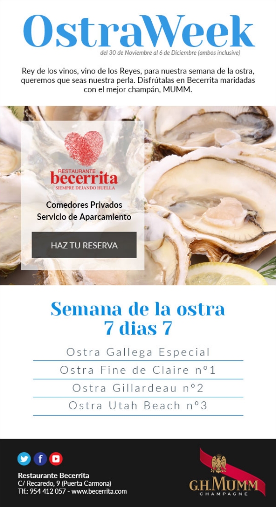 Semana de la Ostra en Restaurante Becerrita 7 días 7 (del 30 de Noviembre al 6 de Diciembre ambos inclusive) Rey de los vinos, vino de los Reyes, para nuestra semana de la ostra, queremos que seas nuestra perla. Disfrútalas en Becerrita maridadas con el mejor champan, MUMM. – Ostra Gallega Especial – Ostra Fine…