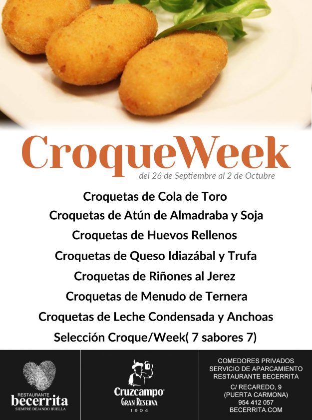 Un año más, Restaurante Becerrita pone de moda a la CROQUETA durante 7 días. ¿Quién se resiste? Ven y marca tu tendencia, 7 sabores y texturas a elegir. SEMANA DE LA CROQUETA EN RESTAURANTE BECERRITA (del 26 de Septiembre al 2 de Octubre de 2016, ambos inclusive) Croquetas de Cola de Toro Croquetas de Atún…
