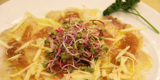 Cortamos láminas de corvina muy finas y la ponemos en el plato. Le rallamos por encima los medios tomates congelados Por encima una manzana cruda rallada y aliñamos con la vinagreta de manzana asada ligada con un poco de vinagre.