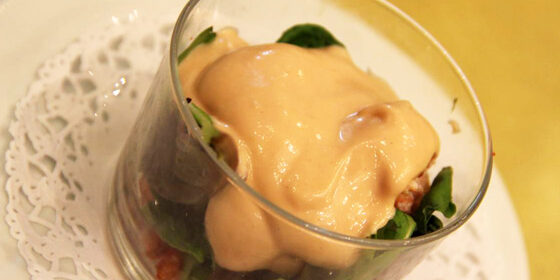 Montamos: En el fondo de la copa la mitad de la carne de bogavante cocida, encima la ensalada y por encima de estos el resto de carne de bogavante cocida. Salseamos y servimos.